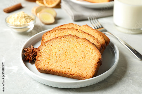 Slices of delicious gingerbread cake served on light grey table