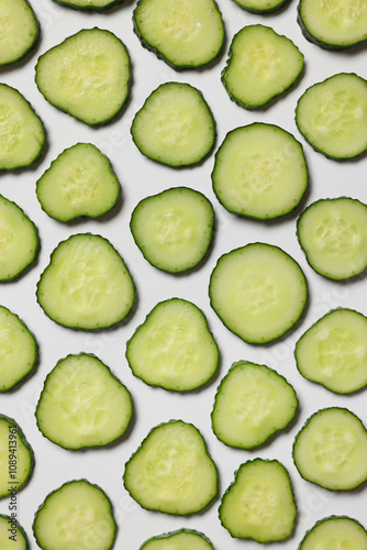 Slices of fresh cucumbers on white background, flat lay