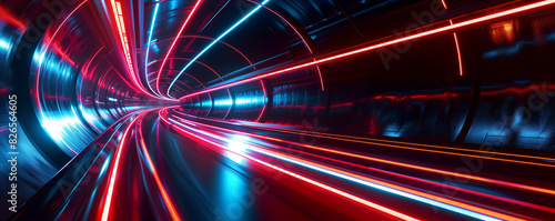 **Slick, glossy black surfaces intersected by glowing red and blue neon lines, conveying a high-speed Hight way in motion.