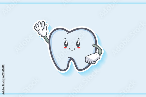 SLIGHTLY SMILE FACE, SLIGHTLY, SMILING, SMILE Face Emotion. Waving Hand Gesture. Tooth Cartoon Drawing Mascot Illustration.
