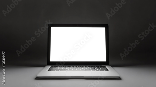 Slim modern laptop displaying a white screen in a dark room, ideal for mockups and presentations