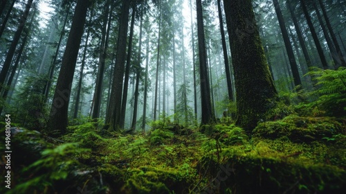 Slim tall trees in dark forest with green moss and ferns and fog, natural style.
