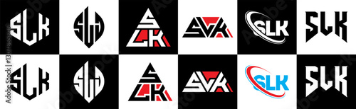 SLK letter logo design in six style. SLK polygon, circle, triangle, hexagon, flat and simple style with black and white color variation letter logo set in one artboard. SLK minimalist and classic logo