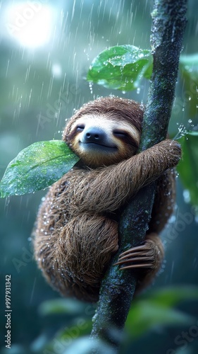 Sloth clinging to tree in rainforest, blending into lush, wet environment as raindrops slide off its fur.
