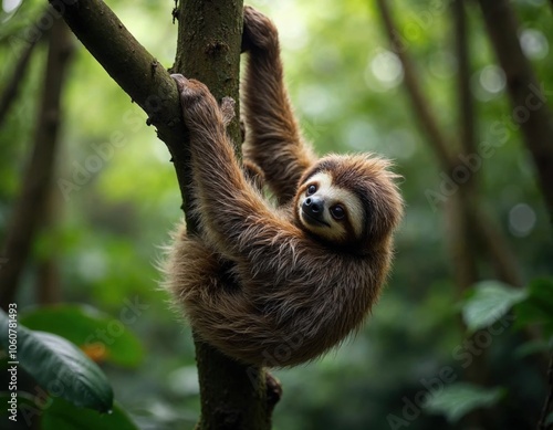 Sloth hanging on a tree branch in a lush green rainforest.