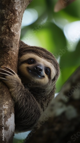 Sloth smiling while hugging a tree, symbolizing calmness and rainforest wildlife.