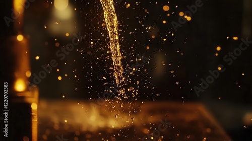 slow-motion view of liquid particles dripping from a faucet, catching light as they fall.