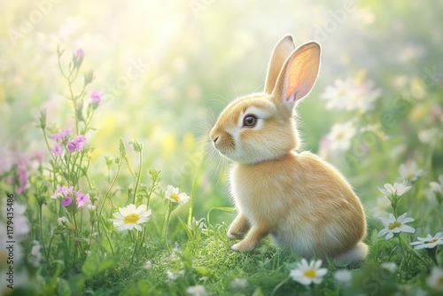 Small brown rabbit sitting amidst colorful wildflowers in a sunlit meadow during spring. Generative AI