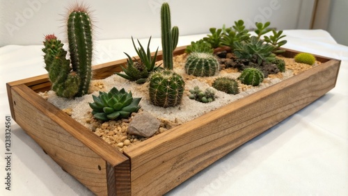 Small cacti in different shapes and sizes are arranged to resemble a miniature desert landscape in a wooden planter, natural elements, desert landscape, small cacti, succulent arrangements