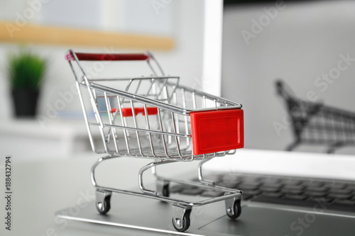 Small cart on laptop keyboard, closeup. Internet shopping concept