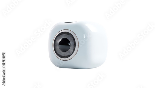 Small, cube-shaped, white device with a large, round, black lens on dark background