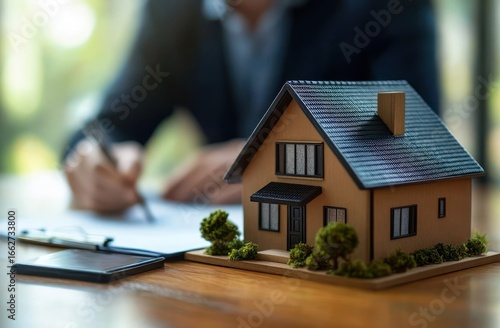 Small detailed house model on a wooden table with blurred person in background writing on paper conveying real estate or home planning concept