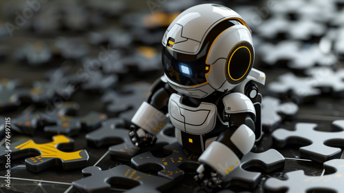 Small futuristic robot assembling jigsaw puzzle pieces on a textured surface