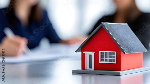 Small house model highlights real estate activity in office setting with agents discussing deals and paperwork