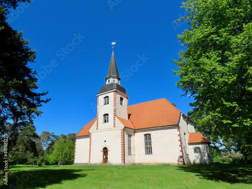 Small lutheran church in Liepupe, Latvia, with red roof and white walls. Sunny summer day
