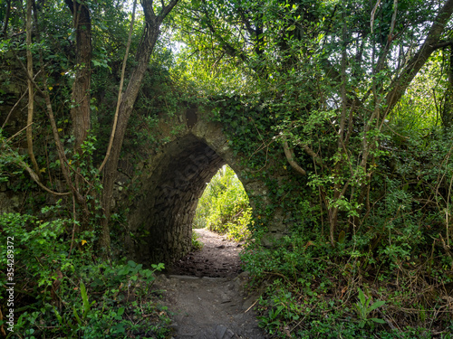 Small old stone arched bridge, hidden in nature undergrowth and weeds. Gateway hidden in green.