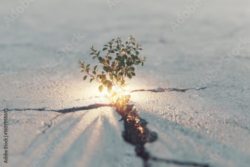 Small plant growing through cracked concrete in white space, symbolizing resilience.