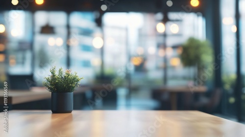 Small plant on wooden table in a blurred cafe setting.