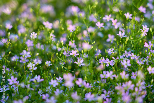 Small purple flowers on a blurred grass. Natural background. Selective focus.