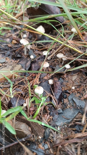 small raining mushroom - A group of small mushrooms, featuring a mix of white and light red colors, grows in the ground. Their caps display a delicate blend of these hues, and the slender stems suppor