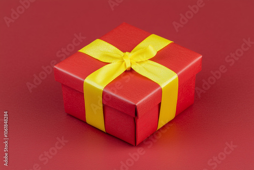 Small red gift box with yellow ribbon on a red background with copy space. Soft lighting. Simple, monochromatic background.