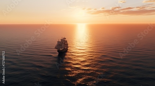 Small sailing ship in the open sea at sunset. Navigation in the 17th century. A majestic 17th-century sailing ship, gracefully navigating the open seas with its billowing sails and intricate rigging.