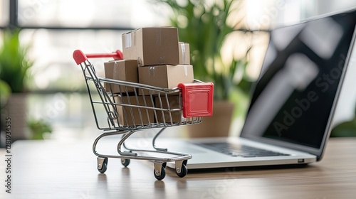 Small shopping trolley loaded with parcels on a wooden table near a laptop, representing digital transactions. --chaos 12 --ar 16:9 --v 6.1 Job ID: 6527794f-86be-4260-b96c-b481fcf7a392