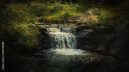 Small waterfall cascading over dark rocks in a lush, green environment.