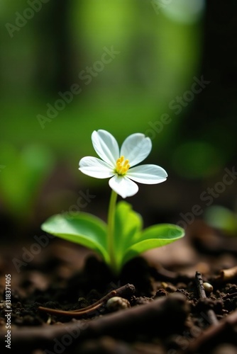 Small white flower blooming in the forest floor, tiny, ground, bloom