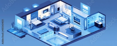 Smart building layout, luxury room technology, detailed infographic, elegant and modern design