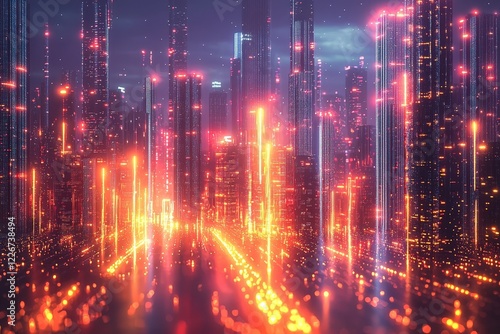 Smart cities abstract futuristic cityscapes with interconnected buildings, colorful lights, and data streams