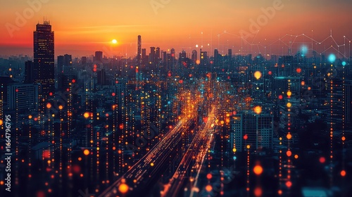 Smart city dashboard powered by AI modeling real-time sustainability metrics, pollution heatmaps, and renewable resource allocation