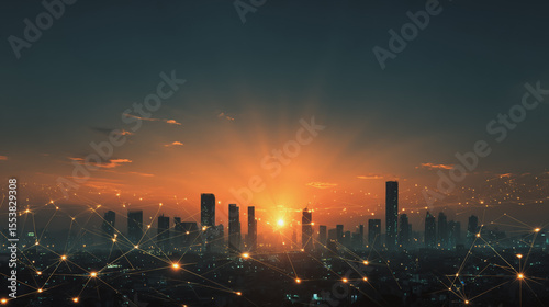 Smart city with connection network reciprocity over the cityscape social media networking systems that connects on the peak of success amid tall, innovative Smart city and graphs with statistics