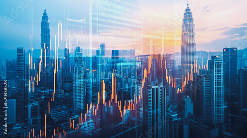 Smart city with connection network reciprocity over the cityscape social media networking systems that connects on the peak of success amid tall, innovative Smart city and graphs with statistics to a