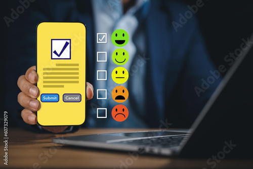 Smart customer man hands pressing on online application screen with excellent 5.0 rating for service evaluation on smartphone virtual touch screen. Customer satisfaction survey experience concept.