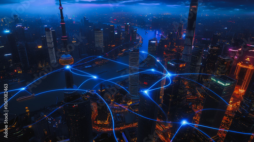 Smart digital city with connection cyber security network reciprocity over the cityscape . future smart wireless digital city and social media networking systems that connects people within the city
