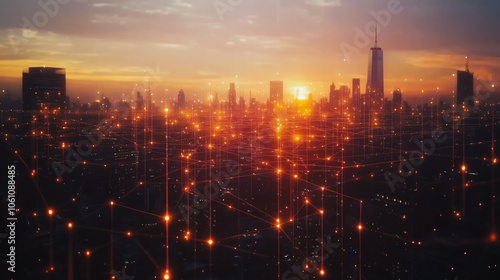Smart digital city with connection cyber security network reciprocity over the cityscape . future smart wireless digital city and social media networking systems that connects people within the city