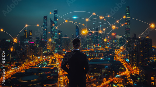 Smart digital city with connection cyber security network reciprocity over the cityscape . future smart wireless digital city and social media networking systems that connects people within the city