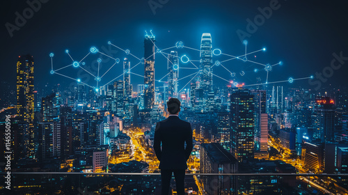 Smart digital city with connection cyber security network reciprocity over the cityscape . future smart wireless digital city and social media networking systems that connects people within the city
