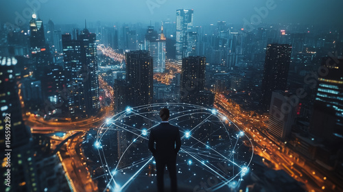 Smart digital city with connection cyber security network reciprocity over the cityscape . future smart wireless digital city and social media networking systems that connects people within the city