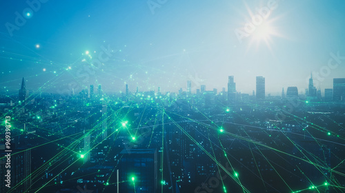 Smart digital city with connection cyber security network reciprocity over the cityscape . future smart wireless digital city and social media networking systems that connects people within the city
