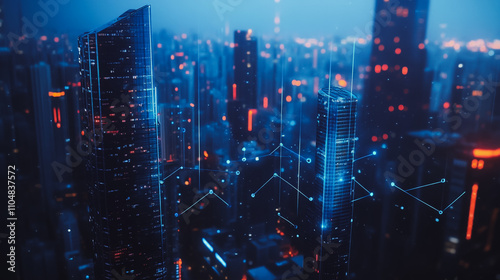 Smart digital city with connection cyber security network reciprocity over the twilight cityscape.future wireless digital city and social media networking systems that connects people within the city