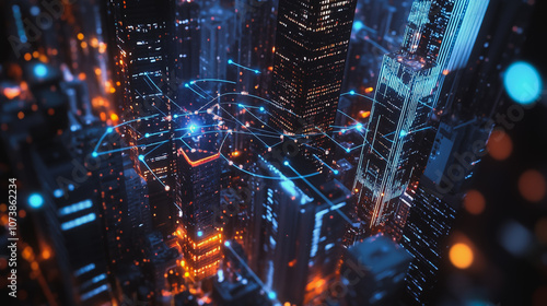 Smart digital Innovation city Business skyscrapers in the Financial District with connection network reciprocity over the cityscape at night time of future smart wireless social media networking