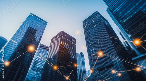 Smart digital Innovation city Business skyscrapers in the Financial District with connection network reciprocity over the cityscape. of future smart wireless digital city and social media networking