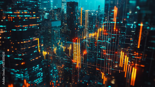 Smart digital Innovation city Business skyscrapers in the Financial District with connection network reciprocity over the cityscape. of future smart wireless digital city and social media networking