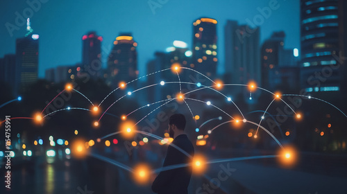 Smart digital Innovation city with connection network reciprocity over the cityscape. of future smart wireless city and social media networking systems that connects business people with in city