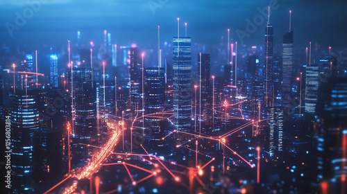 Smart digital Innovation city with connection network reciprocity over the cityscape. of future smart wireless city and social media networking systems that connects business people with in city