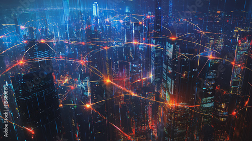 Smart digital Innovation city with connection network reciprocity over the cityscape. of future smart wireless city and social media networking systems that connects business people with in city