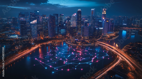 Smart digital Innovation city with connection network reciprocity over the cityscape. of future smart wireless city and social media networking systems that connects business people with in city