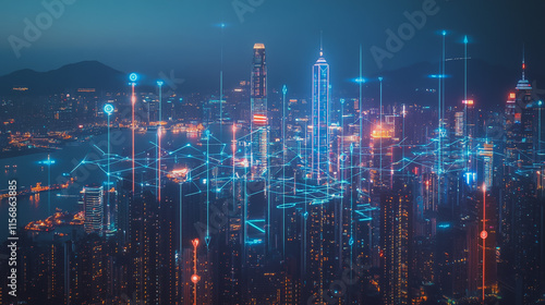 Smart digital Innovation city with connection network reciprocity over the cityscape. of future smart wireless city and social media networking systems that connects business people with in city
